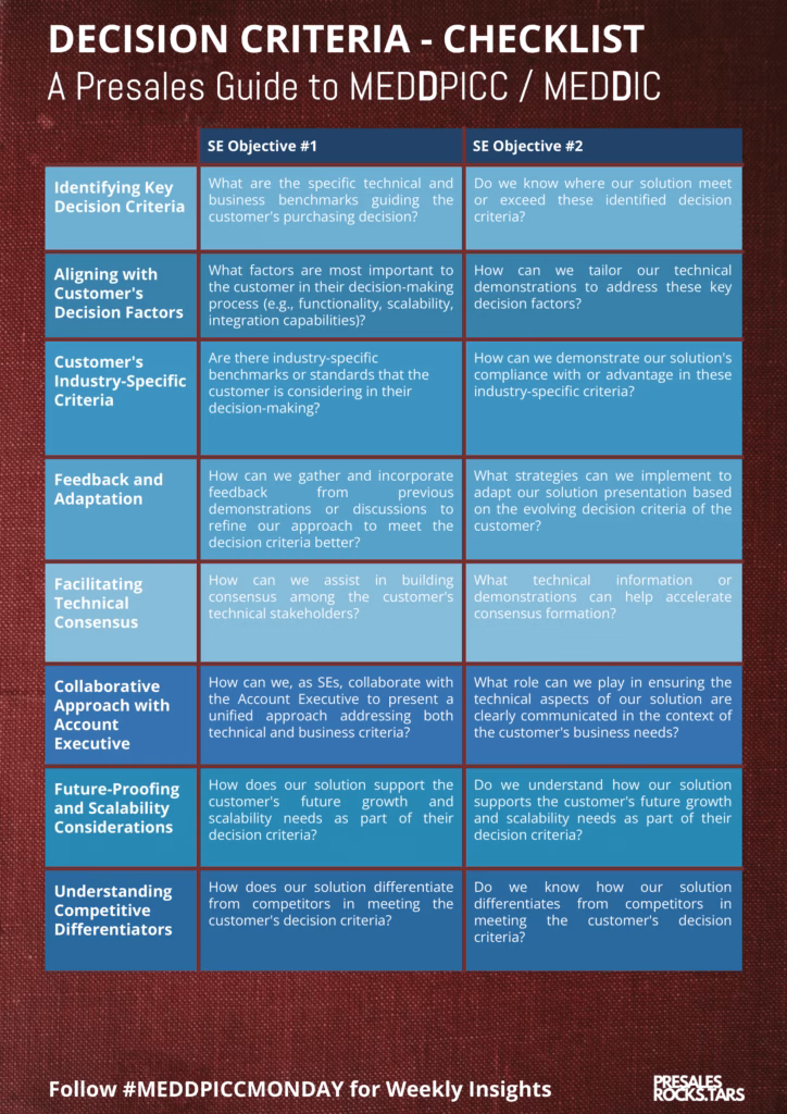 For Solution Engineers, these criteria are extremely helpful. Once you understand what matters most to the customer, you can shape your demo and your explanation around the things they will actually evaluate. This usually starts with a simple conversation about priorities. SEs and Account Executives should do this together so everyone has the same understanding.