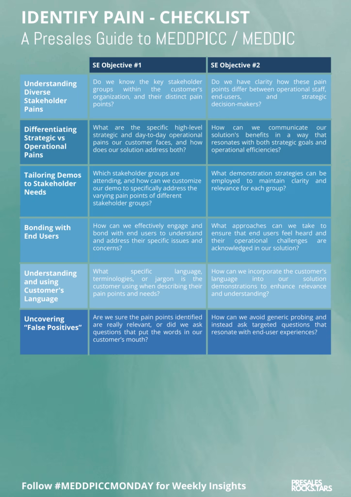 It is also important to understand pain on two levels. Decision-makers talk about strategic pain like cost, risk, or efficiency. End users talk about daily problems like usability, manual work, or missing workflows. SEs need both views to make a complete case.